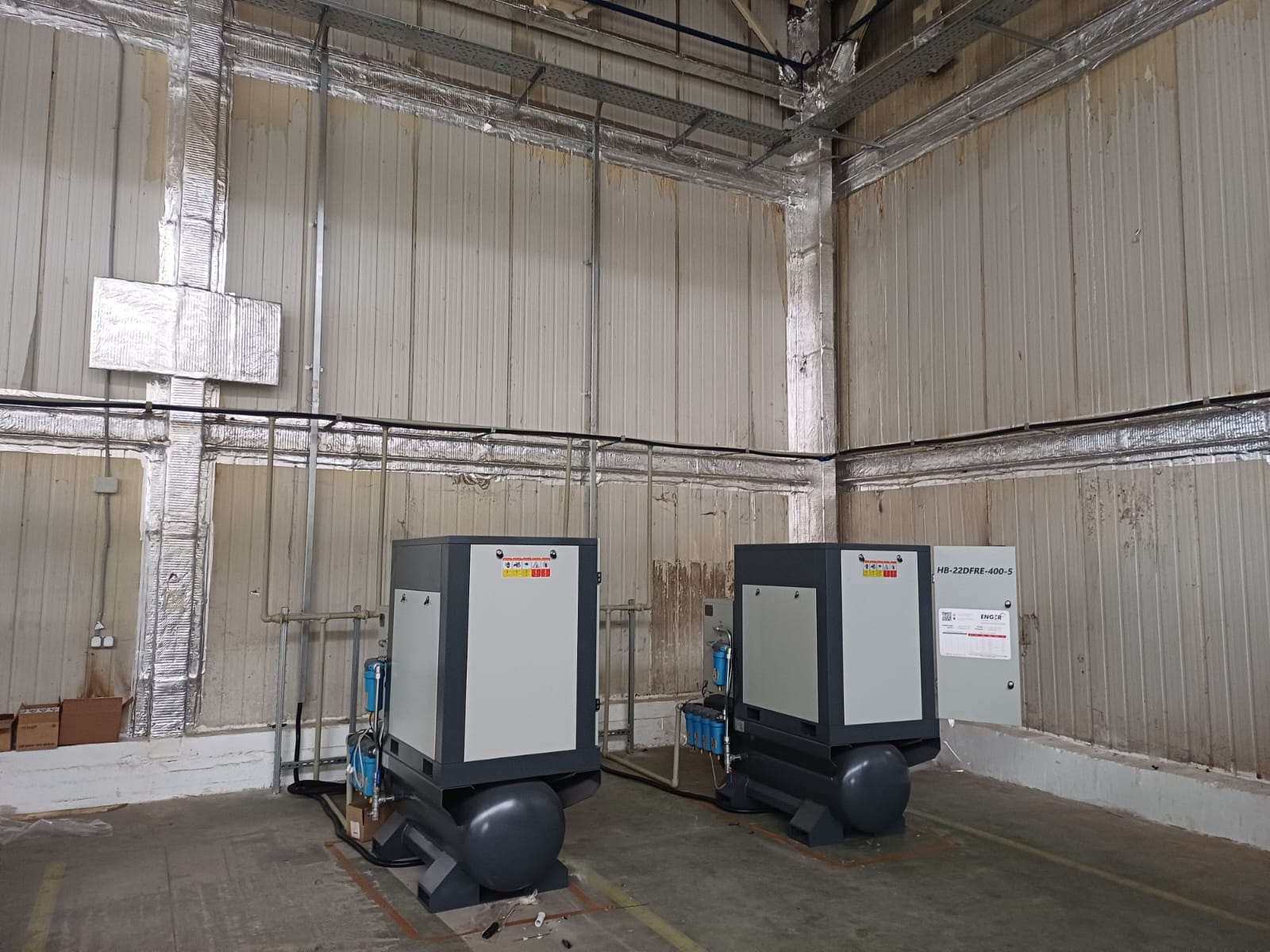 Для лазерного станка на производство были приобретены два винтовых компрессора Enger HB-22DFRE-400-5 16, что позволило обеспечить полное покрытие потребности в сжатом воздухе. Этот компрессор идеально соответствует техническим параметрам, которые поставила перед нами компания, и обеспечивает производительность, необходимую для корректной работы оборудования.